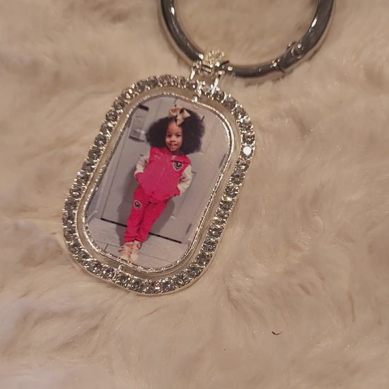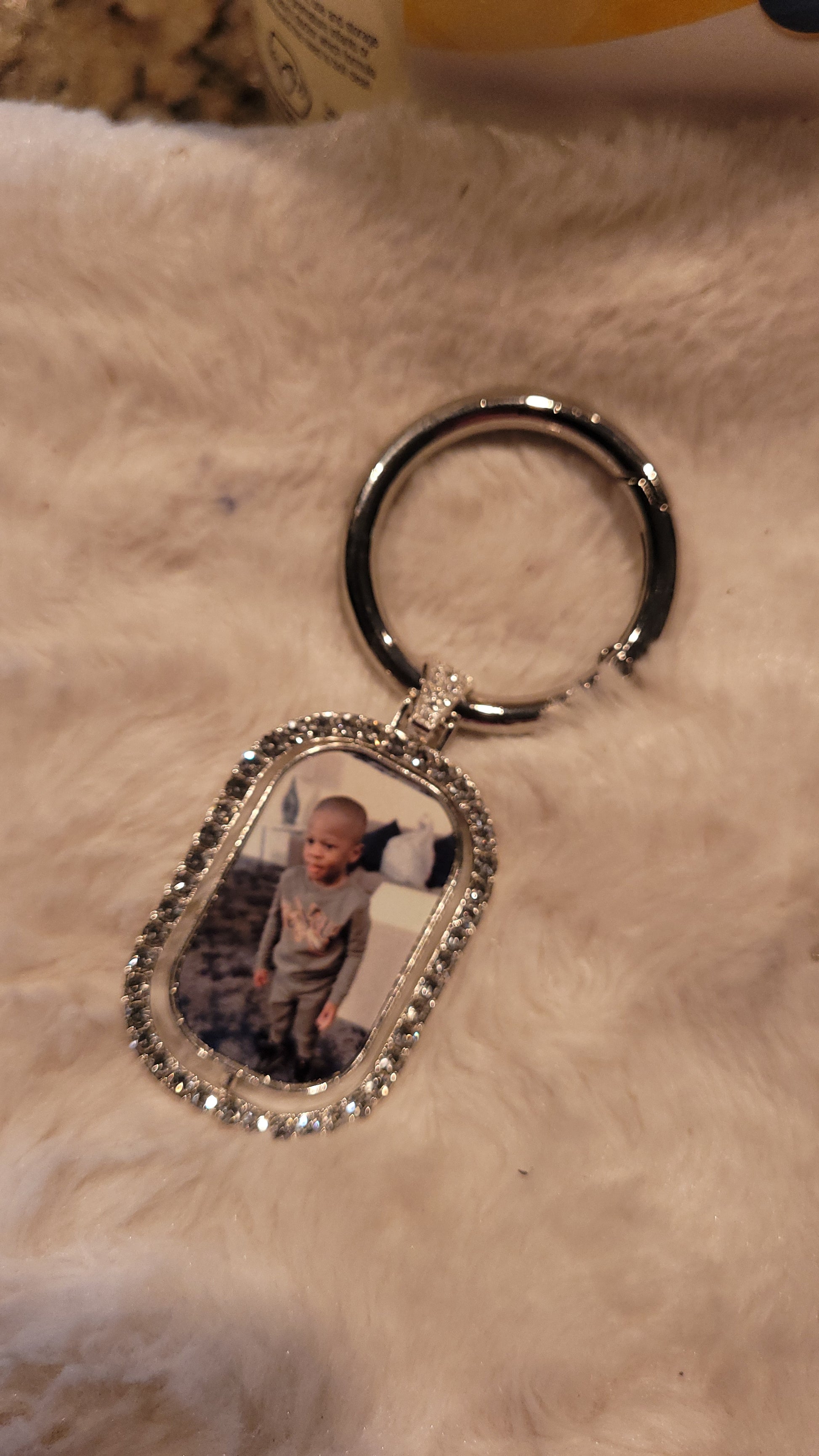 Enhance your personal style with our Rhinestone Photo keychain, featuring a double-sided design with rotating capability. Adorned with elegant rhinestone trim, this silver keychain offers a fashionable way to display your favorite photos. Perfect for adding a touch of personalization to your accessories, it makes for a unique and functional gift.
